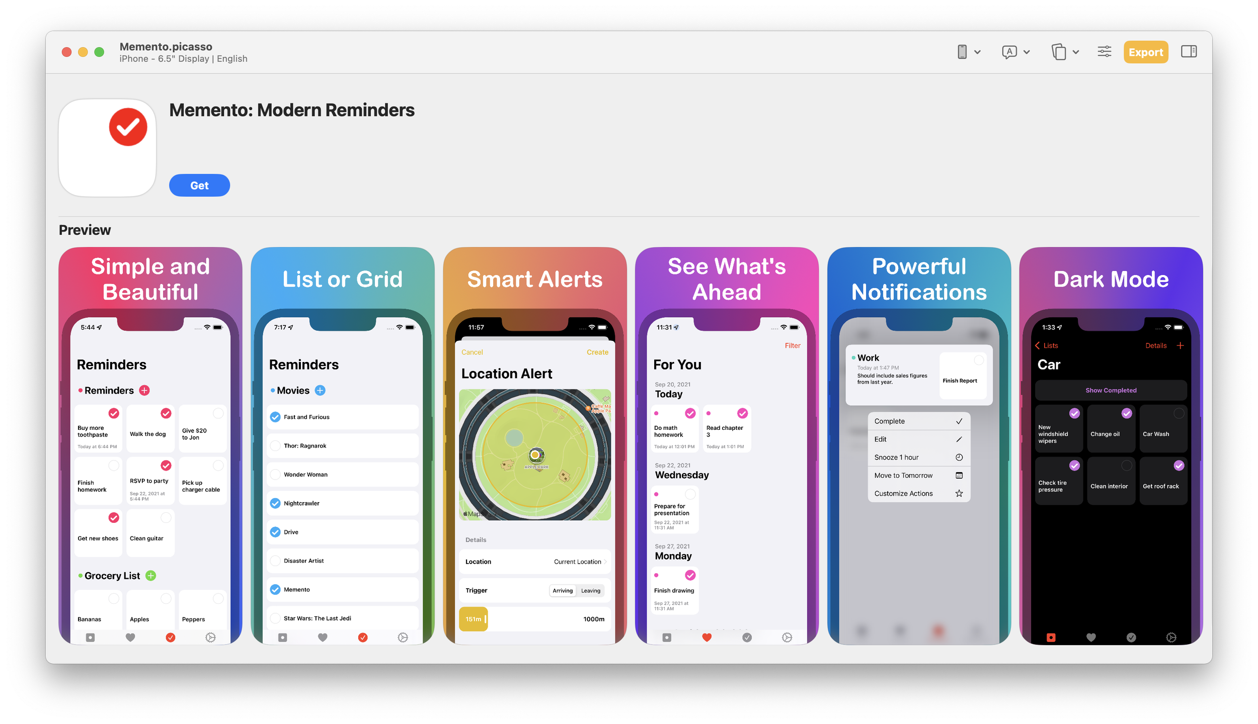 Memento’s screenshots were edited in Picasso, and support 6 device sizes, and 13 different languages!